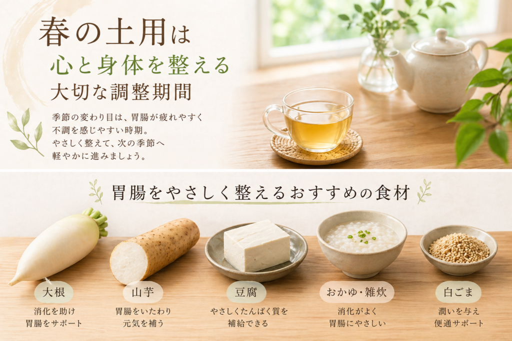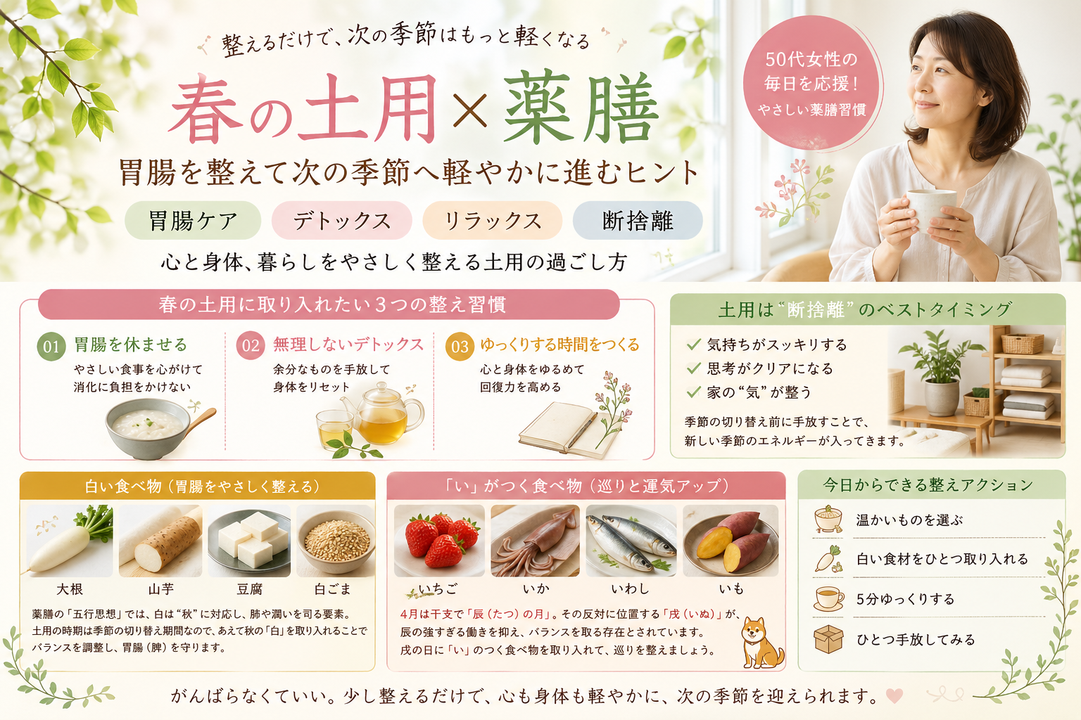 春の土用は、次の季節に向けて心と身体を整える大切な時期。50代女性に向けて、胃腸を整える薬膳の知恵や白い食べ物、「い」のつく食材、無理のないデトックスや断捨離のコツをわかりやすく解説します。